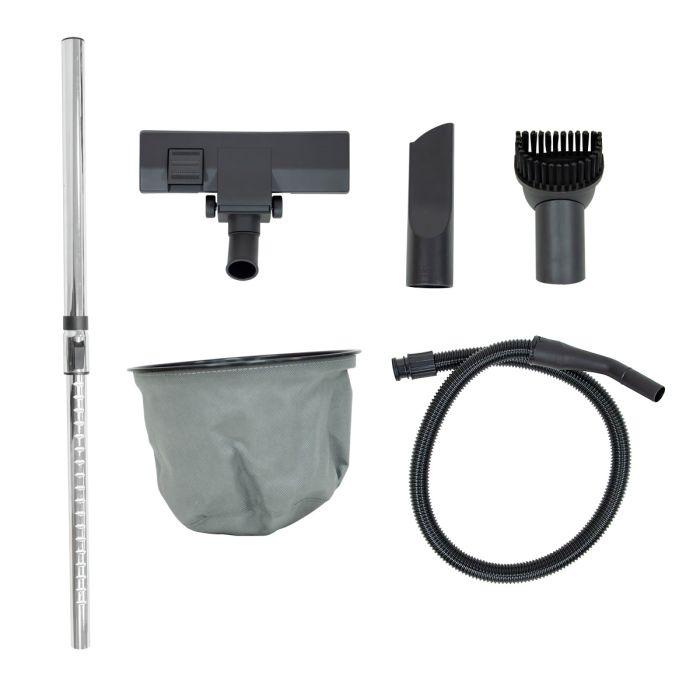 • Accessories included: floor brush with retractable bristles, round brush, crevice nozzle, telescopic metal pipe, 1.5m hose, cloth filter