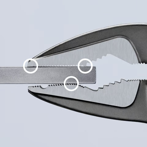 - Long, narrow jaws with front gripping serration: longitudinal gripping profile for round parts such as screws and bolts