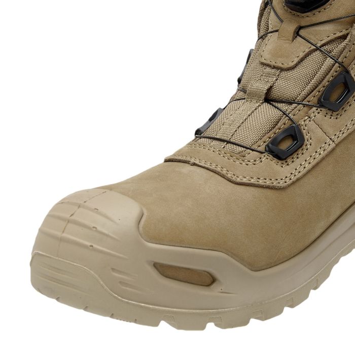 The DeWalt Lander BOA® work boot is designed for superior protection and comfort. Its nubuck leather upper is durable and water-resistant, while the BOA® fit system ensures a precision fit. The composite toe cap and midsole provide supreme protection in hazardous environments, and the toe scuff guard ensures long-term wear. A wider fit adds an extra layer of comfort and stability. Sturdy PU/Rubber outsole which is certified for ladder grip, resistance to fuel oil, scuff cap resistance, slip resistance and heat and oil resistant to 300 degrees celcius. The Lander is also certified to ESD standards. Find your ideal fit with the DeWalt Lander BOA® work boot.
