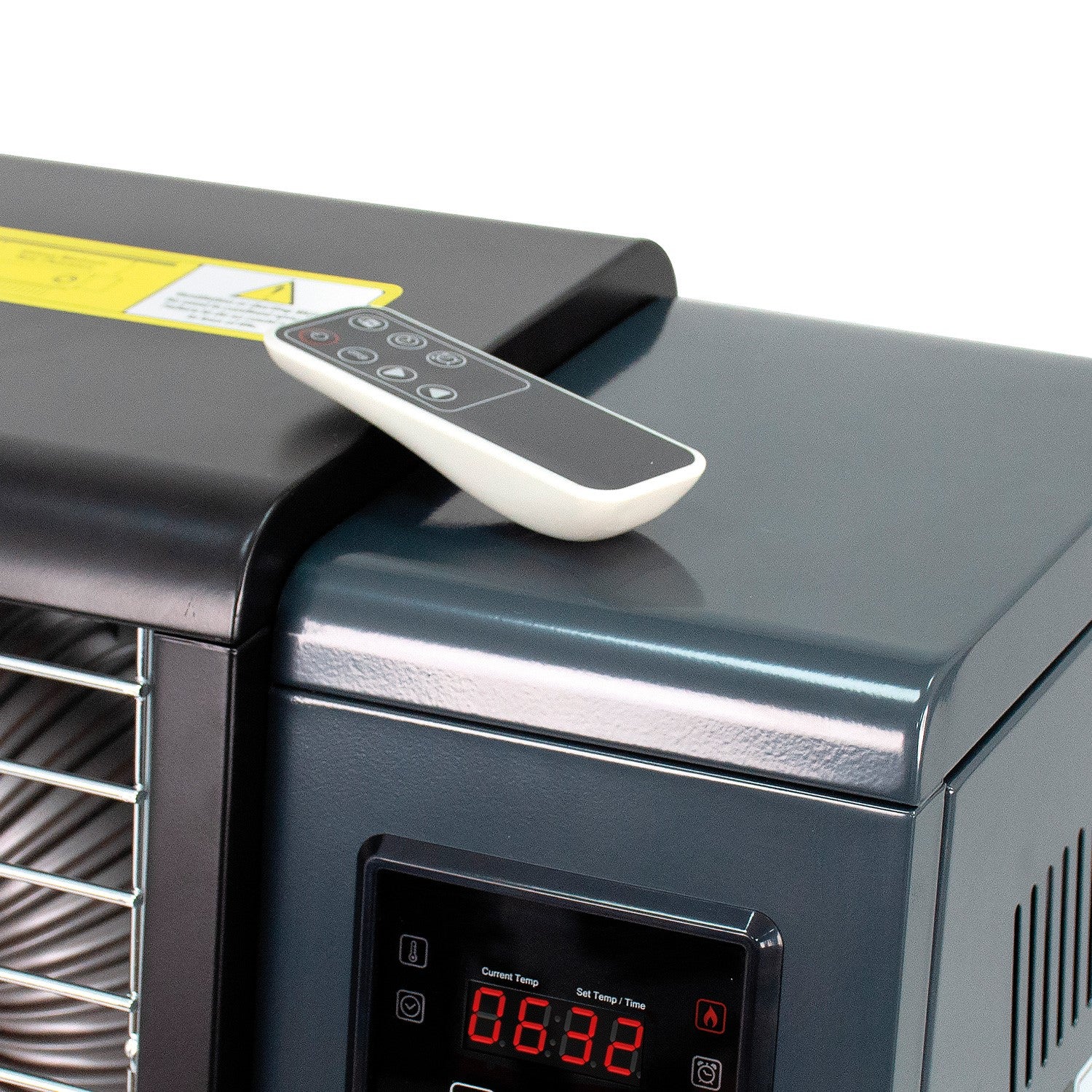 - Thermostat control for regulating heat output. A twin LED digital display indicates room temperature alongside target temperature. Once target temperature is reached the heater will automatically cut-off.