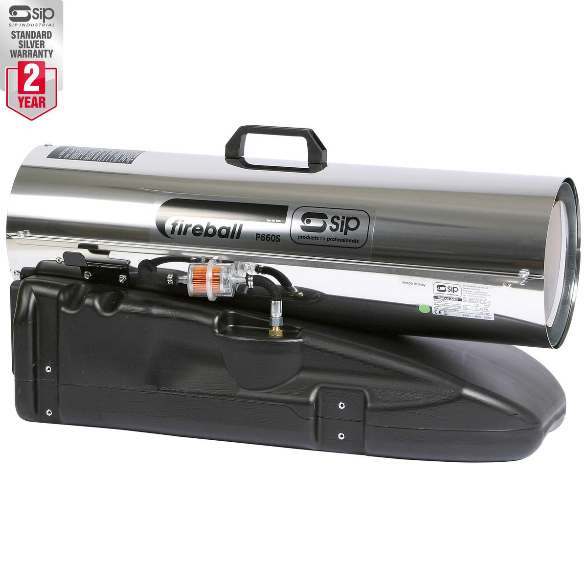 The SIP FIREBALL P660S Professional Space Heater is a portable diesel or paraffin-powered unit built to last, with a low maintenance air pump with proven technology and heavy-duty corrosion-resistant stainless steel casing for added durability and longer life.