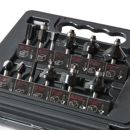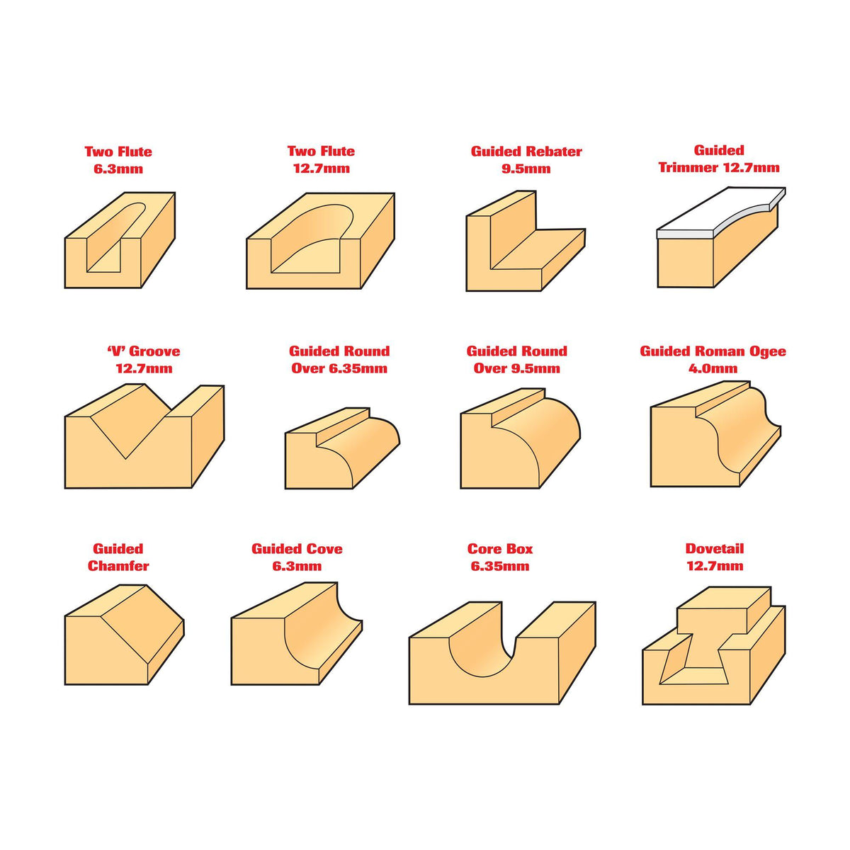 - Includes: Two Flute 6.3mm & 12.7mm, Guided Rebater 9.5mm, Guided Trimmer 12.7mm, 'V' Groove 12.7mm, Guided Round Over 6.35mm, Guided Round Over 9.5mm, Guided Roman Ogee 4mm, Guided Chamfer, Guided Cove 6.3mm, Core Box 6.35mm & Dovetail 12.7mm