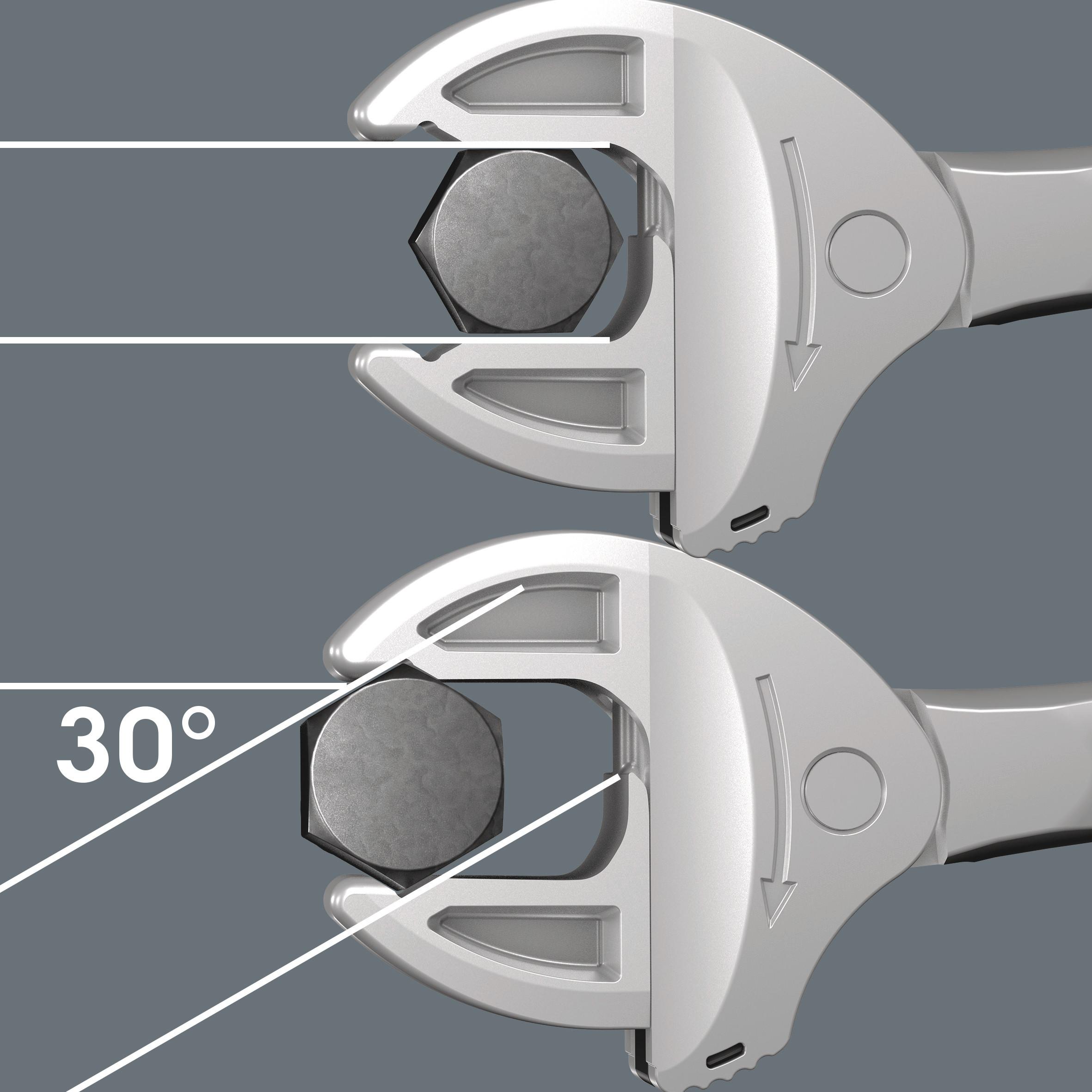 Many users wish to have a universal screwdriving tool with the widest possible range of applications. It should be a single tool for multiple metric and imperial dimensions. It should automatically adjust to the different screw sizes. It should be safe to grab without damaging anything and should allow for high working speeds. With its continuous and parallel jaws the Joker 6004 replaces several single spanner sizes. The required size is automatically and continuously set when attaching the tool to the hexagon bolt or screw. The integrated lever mechanism securely clamps the hexagon screw or bolt between the jaws, which significantly reduces the risk of slippage or damage. The ratchet feature ensures fast and consistent screwdriving without removing the tool. By using the corner-width rectangular prisms, a back-pivoting angle of only 30° can be achieved. The single-arm design, in conjunction with the ratchet feature and the corner-width prism, makes it possible to work even in confined spaces. The adjustable Joker 6004 is the universal screwdriving tool. Self-setting. Gripping. Spanning.